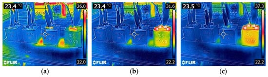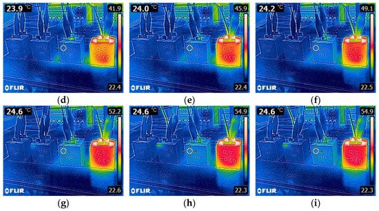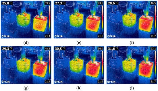 The temperature monitoring/scanning was done every 15 s while maintaining the ambient temperature at 22 ± 1 °C. The temperature measurement was finished either when the internal temperature reached 70 °C or when the run time reached 30 min. An adjustable tripod was used to capture the thermal images at a fixed position.