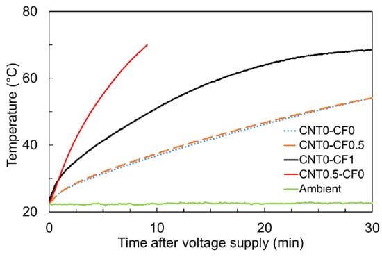 This was also obvious from Figure 12, showing the surface temperature profile of CNT0-CF0, CNT0-CF0.5, and CNT0-CF1 upon 8V DC. Note that there were little changes in the surface temperature during the first 360 s of power supply due to their significantly higher electrical resistivity.