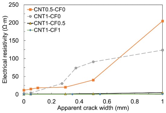 Four different specimens (i.e., CNT0.5-CF0, CNT1-CF0, CNT1-CF0.5, and CNT1-CF1) were tested to see how CNT, CF, and their combination, affected the electrical resistivity under a controlled crack width of up to 1 mm. When only CNT was added (i.e., CNT0.5-CF0 and CNT1-CF0), the electrical resistivity dramatically increased with an increase in crack width, regardless of the CNT content. Particularly, a notable jump in electrical resistivity was observed when the crack width became wider than 0.3 mm. The reason can be attributed to the rupture of the electrical conduction paths upon the occurrence of a crack [33]; because the size of the CNT used in this study was only up to 1/106 of the apparent crack width, CNT no longer provided effective electrical paths across the crack, which subsequently resulted in immensely higher electrical resistivity. However, when up to 1% CF was added in combination with CNT, little increase in the electrical resistance was noted even when the crack width was as wide as 1 mm. This is because 6-mm long CF filaments provided a sufficient bridging effect at the crack interface, allowing the electrons to pass across the crack.