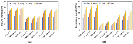 However, when the CNT addition was increased to 1%, a substantial improvement in the mechanical properties was observed. This finding may be explained by the filler effect. When CNT was added up to 0.5% (under percolated mixture), the air entrainment effect can be stronger than the filler effect and thus can reduce the mechanical strengths. On the contrary, when 1% CNT was used (over-percolated), the filler effect controls the mechanical behavior over the air entrainment effect, which can result in higher compressive and tensile strengths [35,40]. For instance, CNT1-CF0, CNT1-CF0.5, and CNT1-CF1 showed 1.19, 3.75, and 1.36 times higher compressive strengths, and 1.53, 1.49, and 1.49 times higher tensile strengths than CNT0.5-CF0, CNT0.5-CF0.5, and CNT0.5-CF1 at 28 days.