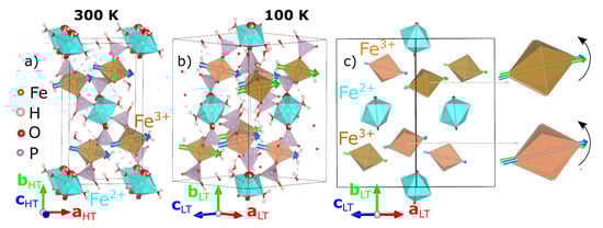 The room temperature crystal structure of Fe3(PO3OH)4(H2O)4 determined in this study is shown in Figure 1a. For the HT crystal structure, we are using the same crystallographic settings for the space group and the unit cell as the one used previously in the literature [30].