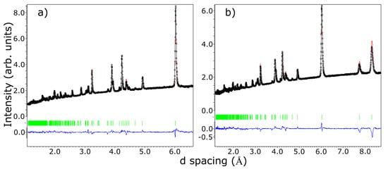 Neutron diffraction measurements collected on WISH instrument at the ISIS spallation neutron source; black open circles represent data collected on bank 3 (2θ = 90 degrees) in panel (a) and bank 2 (2θ = 58 degrees) in panel (b); red solid line represents the results of the Rietveld refinement; blue solid line represents the difference between the model and the experimental data; green vertical lines represent the position of the d spacings corresponding to crystallographic planes in the crystal model.
