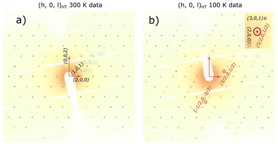 Reconstructed (h 0 l) reciprocal space section at 300 K in panel (a) and 100 K in panel (b) from the data collected at beamline P24. Several superlattice reflections are marked by red circles; the inset shows the zoom in for one of the superlattice reflections.