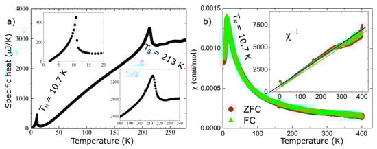 Panel (a) shows the specific heat as a function of temperature; the two insets highlight the low temperature region around TN and high temperature region around TS, respectively, where TN and TS are the temperatures where we have the magnetic and structural phase transitions; panel (b), shows the magnetic susceptibility versus temperature in zero field cooled (ZFC, red symbols) and field cooled (FC, green symbols) mode (H = 100 Oe); the inset shows the inverse magnetic susceptibility data together with two solid lines representing linear fits of the Curie–Weiss behavior, to low and high temperature regions.