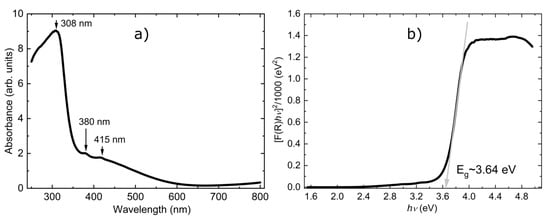 Panel (a) UV–Vis absorption spectra in the 250–800 nm range; the arrows show the three optical bands at 308, 380 and 415 nm. Panel (b) Tauc plot for the direct bandgap; the gray arrow shows a fitted line to the linear part of the curve; the intercept of the gray solid line with the energy axis defines the value of the band gap.