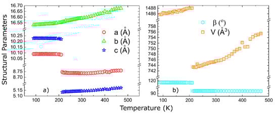 Temperature dependent lattice parameters: panel (a) shows the lattice parameters, while panel (b) shows the monoclinic angle and the unit cell volume.