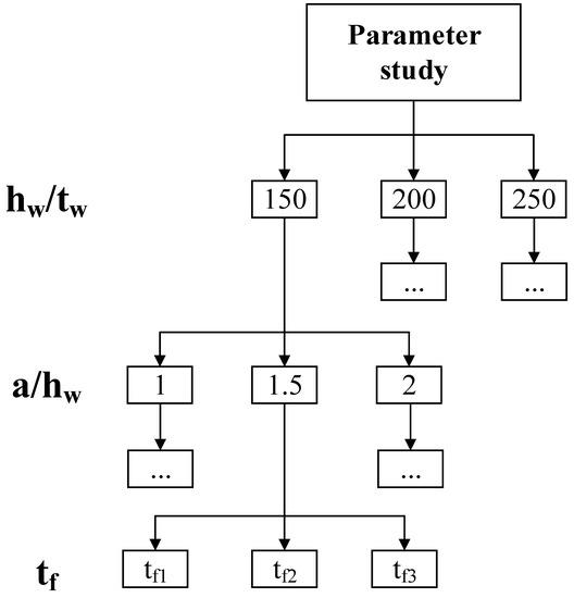 In this study, the parametric research for the S600E sorbite SS plate girders with post-buckling capacity was conducted, in which the different flange thicknesses, depth ratios hw/tw, and aspect ratios a/hw were analyzed (see Figure 11). The height of the web was 750 mm. The different depth ratios hw/tw were obtained by changing the thickness of the web. P1-1-150-40 indicated that a/hw =1, hw/tw = 150, and tf = 40 mm. In terms of the development of the post-buckling capacity and engineering practicability, the hw/tw =150/200/250 and aspect ratio a/hw = 1/1.5/2 were designed. The width of the flange was 200 mm. To investigate the resistance from flange and avoid the flange buckling mode, different flange thicknesses were included in the FEA, as shown in Table 3.