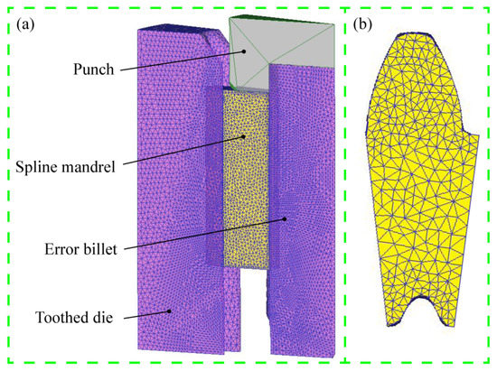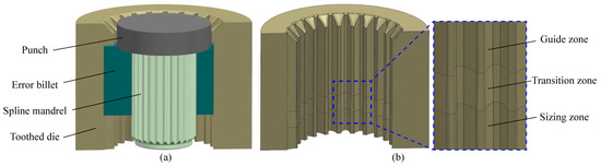 As a classical power transmission part, sun gear with inner and outer teeth has been widely used in automobile driving systems due to its reliable operation, high transmission efficiency and wide applicability [1,2]. As gear manufacturing is a mass production process, precision forging gears should not only ensure continuous and efficient production, but also ensure a reliable die and mold [3,4]. With the development of cold extrusion technology, this net near forming method is more and more adopted in the manufacture of gears. The cold extruded gears have smooth surfaces, continuous metal streamlines and high bearing capacity [5,6]. Therefore, cold extrusion technology has gradually become the main gear processing method. Silveira and Schaeffer [7] evaluated the effects of different die prestress on the dimensional accuracy of extruded gear and die stress and compared to the application effects of the two kinds of shrinkage rings in practical production. Tiernan et al. [8] examined the effects of deformation rate and tool shape on force in the forming process of cold extruded aluminum alloy parts using numerical simulation and experiment methods and analyzed the correlation between simulated and experimental results.