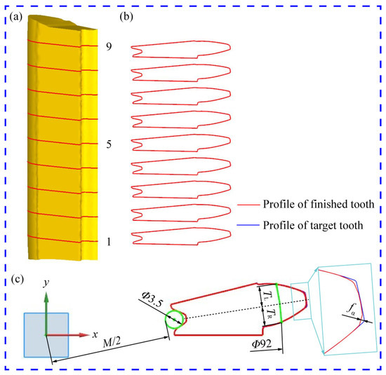 Most research on the dimensional deviation of precision gears primarily focused on the total deviations of tooth helix and profile [18,24]. However, due to the complex structure of the sun gear and the complicated metal flow in the sizing process, the dimensional deviation of the teeth is difficult to control. To investigate the distribution law of dimensional error of finished teeth, an accurate finite element prediction method was developed in this paper, as presented in Figure 5. Firstly, the reshaped teeth were divided into nine sections along the axis, and nine tooth profile curves can be extracted using the post-processing toolbox of DEFORM-3D software. Then, the deviations of the extracted tooth profiles were measured using UG modeling software. The total M-value error of the internal teeth was assumed to be the maximum M-value difference between the reshaped and objective teeth, the total tooth profile deviation of the outer teeth was assumed to be the maximum value of the single tooth profile deviation (fα), and the total helix deviation was assumed to be the maximum difference between the left (TL) and right (TR) tooth thickness of the reshaped and target teeth. The detailed description of the prediction strategy can be seen in the previous research results obtained by our team [25].