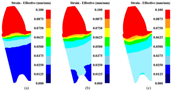 Effective strain of reshaped teeth at various finishing tools: (a) Mandrel with gap; (b) mandrel without gap; and (c) interference mandrel.