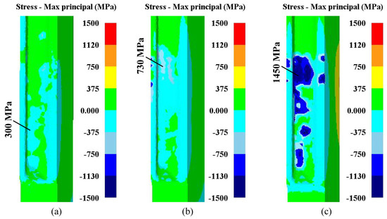 In the precision finishing process, the tools (spline mandrel and toothed die) are subjected to considerable stresses exerted by the billet. It is well-known that smaller compressive stress on the tool surfaces means less plastic deformation and a greater operation time of tools. The max principal stress distributions of spline mandrels illustrated in Figure 8 are the FE simulation results in different finishing tools, where the negative value is compressive stress, and the positive value is tensile stress. The tooth tips of three kinds of spline mandrels are both endured to remarkable compressive stress during the precision finishing operations, which is the main reason for the plastic deformation of spline mandrels. When the spline mandrel was with gap, due to the clearance between the billet and mandrel, the compressive stress on the mandrel was the smallest, at about 300 MPa, as shown in Figure 8a. When the spline mandrel without gap was used, as illustrated in Figure 8b, the billet would be constrained by the spline mandrel, the compressive stress of the mandrel was primarily in the boundary of 0~375 MPa and the max value at the tooth tip was 730 MPa. When the interference mandrel was adopted, the maximum compressive stress at the tooth tip of the spline mandrel was 1450 MPa because the billet fitted well to the mandrel, as denoted in Figure 8c.