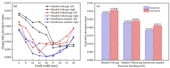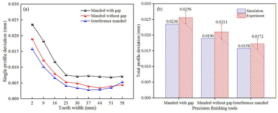 The single profile deviation distributions of the outer tooth at various finishing tools are illustrated in Figure 9a. It can be observed that the tooth profile errors initially diminished sharply and then tended to become stable gradually with the rise in tooth width. Moreover, the errors of reshaped teeth obtained by adopting interference mandrel were smaller than those obtained by using mandrels both with gap and without gap. This is due to the interference mandrel has a better constraint on the billet, which makes the finishing effect of the external gear preferable.