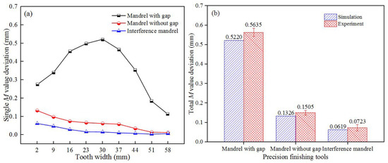The M-value errors of inner tooth gained by both simulations and experiments are shown in Figure 11. As the rising tooth width, single M-value deviations in mandrel with gap grown firstly and then decreased remarkably, and the largest value of 0.5635 mm occurred on the middle region of the formed tooth. This may be explained that, during the process of precision finishing, due to the clearance between the billet and spline mandrel, materials will flow to the inner layer under the push of external gear reshaping, leading to the tiny upsetting phenomenon of big in the middle region and small at both ends. With the enlargement in tooth width, the single M value deviations obtained using mandrel without gap and interference mandrel reduced gradually, and the experimental results of the total M value errors were 0.1505 and 0.0723 mm, respectively. This finding shows that the constraint effect of the spline mandrel can effectively ensure the reshaping quality of the internal spline, which is consistent with the above analysis of the tools.
