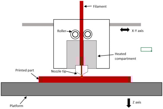 Fused Deposition Modeling (FDM) has been applied in additive manufacturing (AM) technologies because of its operational flexibility, time efficiency, and low cost. The technique is also known as fused filament fabrication (FFF), currently the most common 3D printing technique [,,,]. The ability to construct three-dimensional parts by FDM creates three-dimensional objects by stacking layers of thermoplastic materials with one another. A schematic diagram of FDM can be seen in Figure 2. The filament is pulled through rollers and placed into a heated compartment as the feedstock material. The filament then melts in the heated compartment and extrudes through an extrusion nozzle onto the preheated bed. The construction of the part is organized by the software that gives the coordinates to move into the x, y, and z, plane accordingly. During the printing process, the extruder subsequently moves up into the z-plane to build a layer on top of the constructed layer until a three-dimensional part is fully printed. While depositing the sequential layers, the molten layers of extruded material called lamina form bonds among the adjacent [].