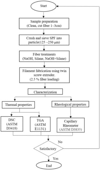 The executions of thermal and rheological experiments provide significant data regarding the determination of employing SPF/PLA composite filaments. Through those experimental studies, the selection of an optimum fibre treatment would enable the authors to decide which procedure is the best method before fabricating the filaments. Hence, the study of the whole process of the experiment is shown in the flowchart in Figure 3.
