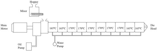 A twin screw extruder with 26 mm twin screws, co-rotating, 40:1 L/D from Lab Tab Engineering Company Ltd., Muang, Samutprakarn, Thailand was used for the extrusion process with 70 rpm screw speed. All the samples of the SPF/PLA composite were put into a barrel of a twin screw extruder. The mixing mechanism before the entrance of the twin screw enabled the SPF particles and PLA pellets to mix well and be conveyed into the melting compartment and extruded through a die, as demonstrated in Figure 4.