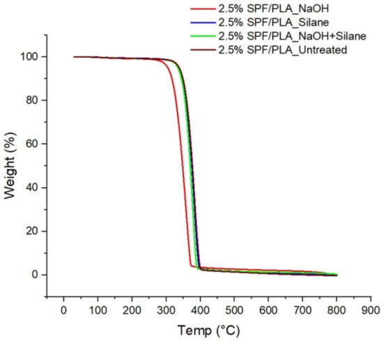 Thermogravimetric analysis is important to determine the thermal stability and kinetic parameters of the SPF/PLA composite. From the TGA data, we can determine the thermal stability and heat resistance of the composite. It is important to investigate the degradation and decomposition of the composite under certain heat exposure to optimize the extrusion capabilities during any application [] and identify the effect of different chemical treatments. TGA curves of filaments with untreated and treated fibres are shown in Figure 5. The TGA curve starts with the evaporation of water molecules, decomposition of lignocellulosic, cellulose, and lignin, and final residue [].