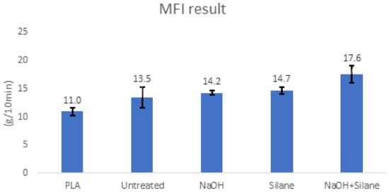 Evaluation of the MFI helps to determine how fibre treatment would affect SPF/PLA’s processability for 3D printing. The value of MFI determines how a polymer material flows in the molten state and is inversely proportional to the dynamic viscosity. It affects the polymer processability and is well linked to the adhesion between layers of printed parts. In terms of PLA, an MFI value above 10 g (10 min)−1 [] is the minimum value needed to ensure good flow properties with no clogging at the nozzle during printing. Pure PLA filament has also been tested as a benchmark for the employment of different chemically treated SPFs. The reduction of MFI and, thus, the increase in the viscosity of the biocomposite materials was related to the reduction in polymer chain mobility []. Figure 7 revealed that the presence of SPF particles in the PLA matrix increased the flow rate of the polymer composite compared with neat PLA. The combination of alkaline and silane treatment showed the highest flow rate of 17.64 g/min, compared to untreated SPF with a flow rate of 13.48 g/min. As from the data received, the largest standard deviation was observed in the untreated composite with a value of 1.8 and the smallest standard deviation was from the NaOH treated composite with a value of 0.4. The higher MFI value was probably due to a significant amount of auto-polymerization silane molecules, which contain lighter-weight molecules, resulting in the easy flow of biocomposites []. This finding is similar to those of Moustafa et al. [], who found that the MFI of spent coffee ground (SCG) filler increased respectively with the amount of SCG content. The combination of alkaline and silane treatment, as expected, eliminated all impurities and unwanted substances (hemicellulose, lignin, and pectin), which led to greater bonding with the PLA matrix. The flow was smoother, and MFI was higher compared to untreated fibre, in which the fibre and polymer were poorly bonded, resulting in a slower flow rate []. Similar results were also reported by Eselini et al. [], who discovered that the MFI of the basal, flax/PLA composite was larger than the PLA. The MFI values were increased by the incorporation of basalt fibre (BF) and flax fibre (FF) into the PLA matrix. During the processing of composites, the increased amount of fibre added to PLA increases the shear stress. This may account for the increase in the MFI value of PLA after fibre incorporation. At the same fibre content and coupling agent levels, the MFI of the treated fibre composite was higher than the untreated fibre composite.