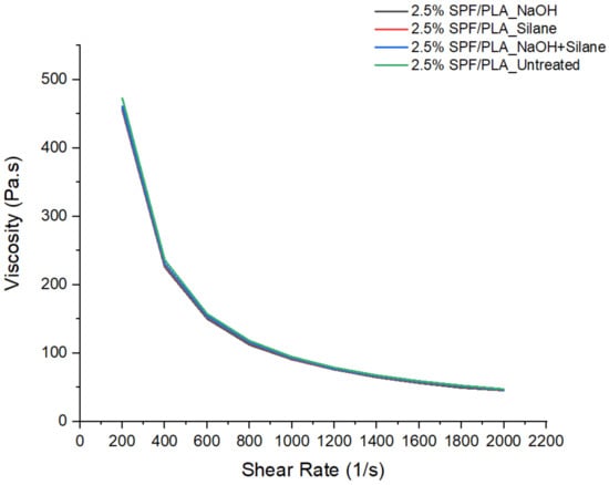 The purpose of performing the rheological test was to determine how the stress in a material or force applied is related to the deformation and flow of the sugar palm fibre polymer composite. The Instron SR20 was used to identify the rheological properties of the samples. Rheological tests were successfully performed starting at a temperature of 175 °C. At this temperature, the composite material was able to flow out through the nozzle. As a result, this is the recommended minimum temperature for the printing process of FDM. However, during a trial of printing the composite filament using a 3D printer, it was found that the suitable temperature for the nozzle setting was in the range of 190~200 °C, slightly higher than the set temperature of the rheological test. As observed, there were no significant differences in viscosities curves between the untreated SPF/PLA composite and the chemically treated NaOH and the silane SPF/PLA composites. Those curves are typically shear thinning, thus demonstrating the non-Newtonian behavior of fluids whereby the viscosity decreases under shear rate. It is synonymous with pseudoplastic behavior [], which is mainly influenced by the orientation of polymer molecules, the agglomeration of sugar palm fibre, and entanglements within the PLA chains in the capillary rheometer. The agglomeration increased the viscosity as the fibres intertwined in the composites. Thus, it prevented the flow of the matrix through the composite. The difference in the curve might occur if the SPF content is not fixed or higher than 2.5% fibre content. Mazzanti et al. [] found that the higher hemp fibre content in the PLA matrix shows a significant drop in the viscosity curve. The very dilute nanocomposites such as the SPF/PLA composite only caused a negligible increase in the viscoelastic function concerning the pure matrix because of the hydrodynamic interactions among the particles. As seen in Figure 8, the same curve pattern between the untreated and chemically-treated SPF/PLA is similar to the finding by Durmus [] who concluded that the employment of an adhesion promoter or a compatibilizer in wood polymer composite (WPC) composition and its amount and specification are more important parameters than the size of the wood particle and the chemical treatment which enhanced the interfacial interactions between the PP and the wood fibre.