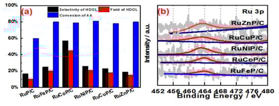 The substitution of rare-earth metals for precious metals has always been the core topic of synthesis methods. 3d transition metals exhibit different chemical properties than 4d or 5d transition metals. Smaller static positions, lower electronegativity, and the potential involvement of one-electron processes provide the first-row transition metals with unique properties in related catalysis [34]. Hence, the first-row transition metals (M), including Fe, Co, Ni, Cu, and Zn, were selected to alloy with Ru in this work because the electronic effect between Ru and the transition metals has been demonstrated to promote the catalytic activity of Ru [35]. Here, a series of transition metal-doped RuMP (M = Fe, Co, Ni, Cu, and Zn) alloys was prepared and used for catalyzing the hydrogenation of AA. As shown in Figure 1, all as-prepared RuMP catalysts exhibited good catalytic performance for the hydrogenation of AA verified by 60~80% of conversion of AA. Among all the doped RuMP catalysts, RuCoP catalysts demonstrated the best selectivity (80%), indicating RuCoP alloys were the best catalyst for hydrogenation of AA to HDOL.