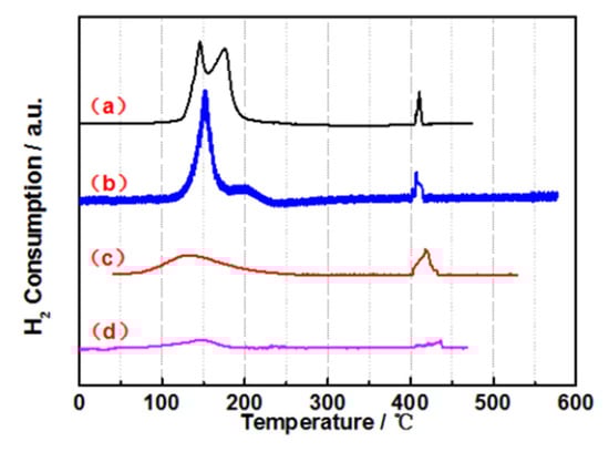 H2-TPR spectra of the amorphous alloy catalysts: (a) Ru1.0Co7P20/C, (b) Ru1.0Co17.5P20/C, (c) Ru1.0Co17.5P33.5/C and (d) Ru0.2Co7P20/C.