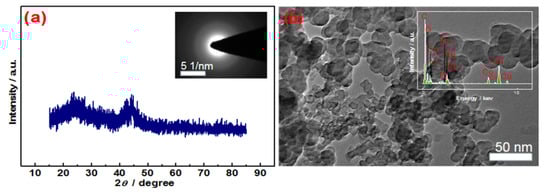 The physical feature of the optimized RuCoP/C sample was characterized for revealing the origin of its catalytic activity. A broad peak at ca. 2θ = 45° was observed in the XRD pattern of fresh RuCoP/C catalyst except for the graphite peak of carbon (2θ = 26°) (Figure 3a), suggesting its amorphous structure [36], which was also confirmed by a halo ring in the selected area electron diffraction (SAED) image (Inset of Figure 3a). In the TEM image of RuCoP/C (Figure 3b), the particles with an average size of ca. 50 nm were the typical morphology of the commercial carbon support. EDX (Inset of Figure 3b) exhibited that there are Ru, Co, and P atoms in these particles. In the zoom-in TEM image (Figure S4a), small nanoparticles with a size of ca. 1 nm were found. However, clear lattice fringes cannot be observed in Figure S3b, suggesting the existence of amorphous phase. The XRD and TEM results reveal that the obtained RuCoP nanoparticles formed on carbon are ultrasmall and amorphous. Based on the above results, an amorphous structure and a small particle size were attributed to the catalytic performance of RuCoP/C. Herein, pretreated activated carbon is used as a typical support to understand the role of the Ru/Co/P atomic ratio in promoting the chemical and surface properties as well as the catalytic behavior [37].