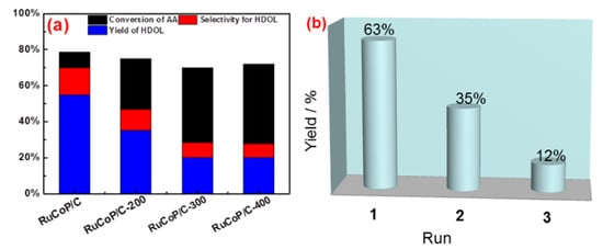 Hydrogenation of AA to HDOL on RuCoP/C, RuCoP/C-200, RuCoP/C-300, and RuCoP/C-400 (a); stability of the amorphous RuCoP/C catalyst in hydrogenation of AA to HDOL (b).