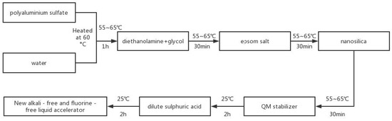 The preparing method of the new alkali-free and fluorine-free liquid accelerator is shown in Figure 1. Each component is weighed according to the mass percentage, and the proportions. The mass ratio of polyaluminum sulfate: diethanolamine: ethylene glycol: magnesium sulfate heptahydrate: nano-silica: QM stabilizer: dilute sulfuric acid: water is 57:6:1:2:2:3:1:28. The new alkali-free and fluorine-free liquid accelerator is made by the following steps.