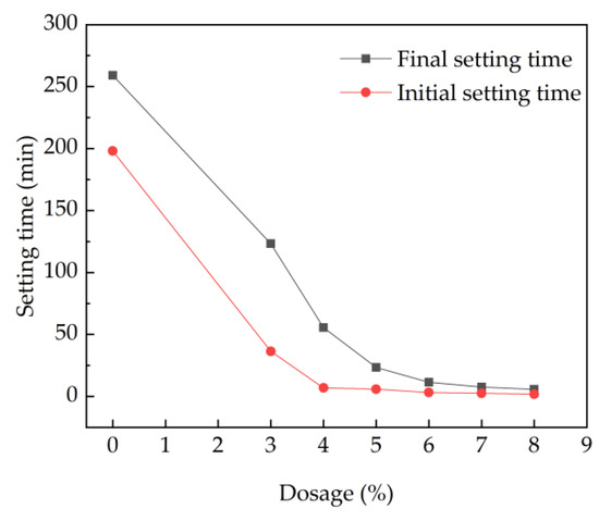 The initial setting time and the final setting time of fresh cement paste are shown in Figure 2. As shown in Figure 2, the initial setting time and the final setting time decrease with the increasing dosages of the accelerator. As depicted in Figure 2, when the dosage of accelerating agent is 0%, the initial setting time is 198 min and the final setting time is 259 min. When the dosage is 3%, the setting time has an obvious downward trend, showing the initial and final setting time of 36.4 min and 123 min, with decreasing rates of 81.6% and 52.5%, respectively. The dosage of 4% is the threshold value. This is ascribed to the fact that when the dosage of accelerator is 3%, the polyaluminum sulfate is consumed in the hydration of cement, and the Ca2+ in cement minerals is not completely consumed. At the same time, the trisulfide hydrated calcium sulfoaluminate and hydrated calcium silicate generated cannot make the slurry set rapidly. Zhang et al. obtained a similar conclusion that the low dosage of accelerating agent resulted in less hydration production and the coagulation-promoting effect was not obvious [36,37].