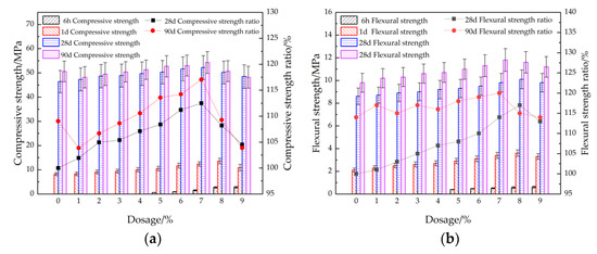 Figure 3 shows the compressive and flexural strengths of cement mortar with different dosages of accelerator with curing ages of 6 h, 1 d, 28 d and 90 d respectively. As observed from Figure 3, the compressive and flexural strengths of cement mortar increase with the increasing curing age and firstly increases and then decreases with the increasing addition of accelerator. When the dosage of accelerator is 7%, the mechanical strengths of the cement mortar is the highest. This is attributed to the fact that when the dosage of accelerator increases from 0% to 7%, a large amount of Al3+ and SO42− is increased by polyaluminum sulfate hydrolysis in the accelerator, which reacts quickly with Ca2+ produced by hydration of cement clinker and generates a large amount of needle-like hydrated 3CaO·Al2O3, forming a skeleton structure. Therefore, the mechanical strengths are increased. However, when the increasing dosages of accelerator is higher than 7%, the excessive SO42− induced by accelerator can react with Ca2+, forming a large amount of dihydrate gypsum. The newly generated dihydrate gypsum can continue to react to generate a large amount of expansive hydrated calcium sulfoaluminate; therefore, the mechanical strengths are decreased by the addition of accelerator [38,39,40]. The error values are small and the test results are accurate.