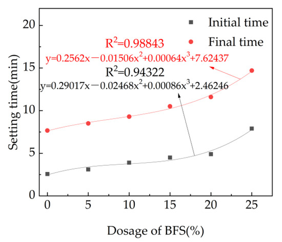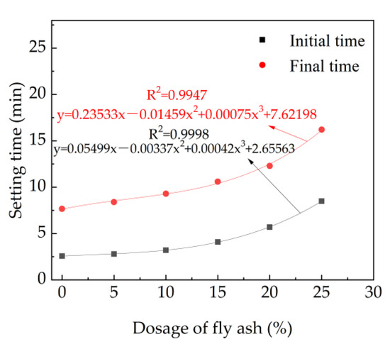 The setting time of fresh cement paste with different dosage of fly ash and 7% accelerator is shown in Figure 4. As depicted in Figure 4, the initial and final setting time increase with the equation of the mass ratio of fly ash. This is attributed to the fact that the contents of 3CaO·SiO2, 2CaO·SiO2,3CaO·Al2O3 and 4CaO·Al2O3·Fe2O3 decrease with the addition of fly ash [41]. Moreover, as reported in prior research, fly ash contains active SiO2 and active Al2O3, and hydration reaction can occur only under the excitation of alkaline conditions, which makes the early activity of fly ash difficult to excite [42]. Therefore, the hydration rate of cement is decreased with the increasing dosages of fly ash, leading eventually to increasing the setting time, as observed in Figure 4, and relationships between the setting time and the mass rate of fly ash can be deduced as cubic functions.