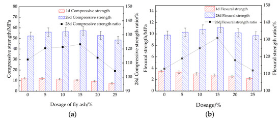 The mechanical strengths of cement mortar with fly ash. (a) Compressive strength, (b) flexural strength.