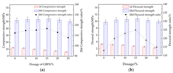 The mechanical strengths of cement mortar with BFS. (a) Compressive strength, (b) flexural strength.