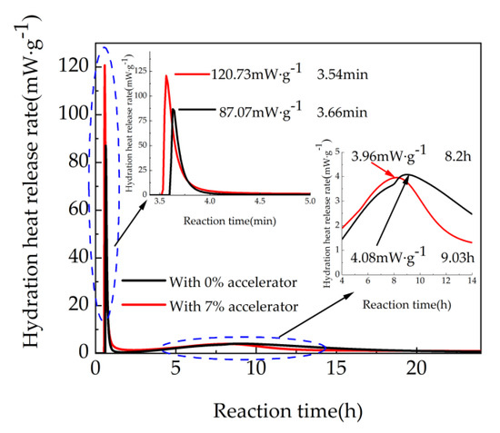 According to the above results, the cement mortar with 7% accelerator shows the maximum mechanical strengths; therefore, in this part, cement mortar with 7% accelerator is selected for the measurement of heat of hydration. The hydration heat release rate curves are illustrated in Figure 8. It can be observed from Figure 8, the shapes of the hydration exothermic curves with 0% and 7% accelerator are similar. The first exothermic peak of the hydration exothermic curves with 0% and 7% accelerator appears in 3.66 min and 3.54 min, while the corresponding second exothermic peak appears in 9.03 h and 8.2 h. As shown in Figure 8, the first peak values of the two hydration exothermic curves are 120.73 m·Wg−1 and 80.07 m·Wg−1, respectively. Meanwhile, the second peak values of the two hydration exothermic curves are 3.96 m·Wg−1 and 4.08 m·Wg−1, respectively. The main reason is that Al3+ and SO42− in the accelerator consume Ca2+ in the liquid phase, leading to generating ettringite and releasing more heat and promoting the hydration of cement [44].