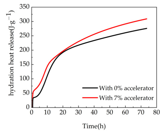 The total hydration heat release of cement is illustrated in Figure 9. It can be observed from Figure 9, the hydration heat release firstly increases sharply and then increases steadily with the time. This is attributed to the fact that the hydration rate of cement is relatively fast when at the early curing age. However, with the increasing curing age, the hydration rate can descend. The samples with 7% agent show higher hydration heat release than the blank samples. This is ascribed to the fact that the addition of accelerator leads to increasing the hydration reaction of 3CaO·Al2O3 in cement. Moreover, due to the pozzolanic activity of ultrafine nano-silica in the accelerator, the accelerator can react with Ca(OH)2 generating hydrated calcium silicate gel and improving the hydration rate [45]. Therefore, the total amount of hydration heat release of the experimental group is higher than that of the blank group.