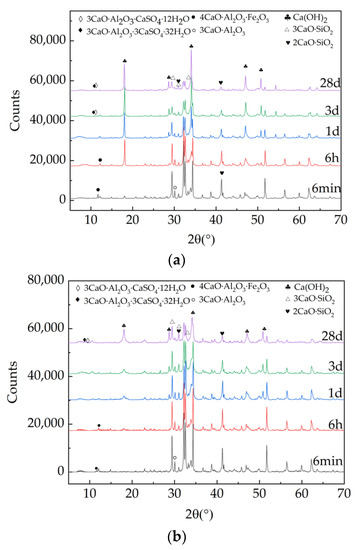 Figure 10 shows the X-ray diffraction spectrum of blank cement paste and cement paste with 7% accelerator. It can be depicted in Figure 10, the 3CaO·SiO2, 2CaO·SiO2, 3CaO·Al2O3 and 4CaO·Al2O3·Fe2O3 can be found [46,47,48]. With the extension of curing age, the characteristic diffraction peaks of Ca(OH)2 became more obvious. Obvious 3CaO·Al2O3 diffraction peaks can be found in the samples with accelerator at all curing ages, indicating that a certain amount of 3CaO·Al2O3 is formed at 6 min of hydration. However, in the blank group, the aft diffraction peak could not be found until the curing age is 6 h.