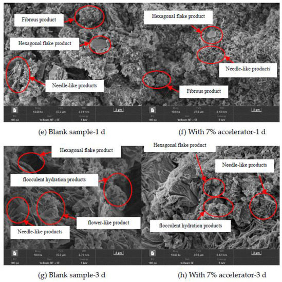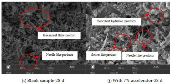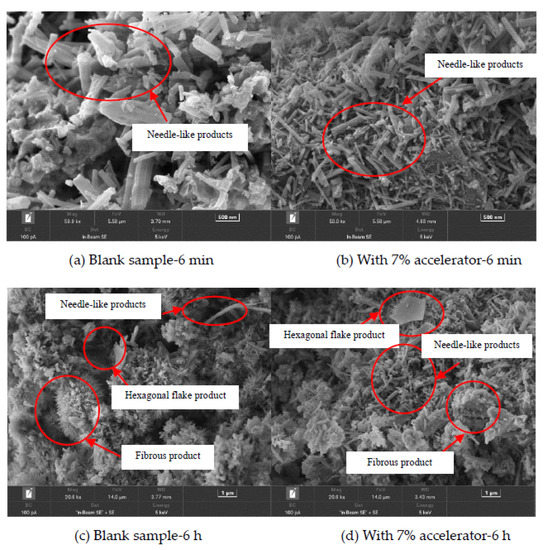 Figure 11 shows the scanning electron microscopy (SEM) photos of the blank specimens and the specimens with 7% accelerator cured for 6 min, 6 h, 1 d, 3 d and 28 d, respectively. It can be observed in Figure 11 that with increasing curing age, the amount of needle-like products decreases and the hexagonal flake and flocculent products increases, due to improved hydration degree. As depicted in Figure 11, the addition of accelerator leads to decreasing the needle-like products and improving the compactness of the hydration products at early curing age (the curing age is lower than 3 d). However, when the curing age is 28 d, little difference can be found in the SEM photos of the blank specimens and the specimens with 7% accelerator. This is because the accelerator can accelerate the early hydration process of the cement.