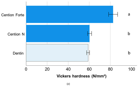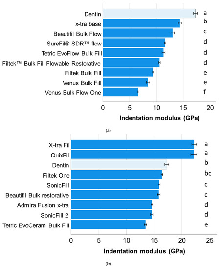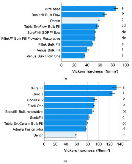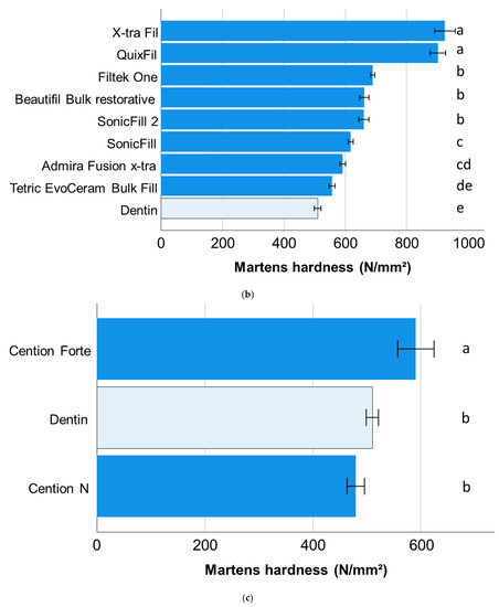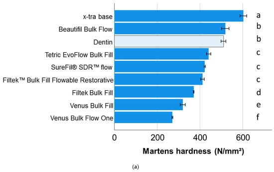 The statistical analysis is somewhat similar for the Vickers hardness, while dentin has similar HV values as Filtek Supreme XT flow and Tetric EvoFlow bulk-fill in the light-cured low-viscosity bulk-fill RBCs (Figure 2a) and lower values than all analyzed high-viscosity bulk-fill RBCs (Figure 2b). For dual-cured bulk-fill RBCs, the ranking was similar to that for HM (Figure 2c).