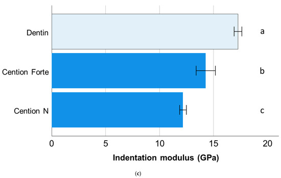 A completely different situation was observed for the indentation modulus. Dentin ranked highest among all light-cured low-viscosity bulk-fill RBCs (Figure 3a) and was surpassed only by X-tra Fil and QuixFil among the high-viscosity bulk-fill RBCs (Figure 3b). Cention Forte still outperformed Cention N in dual-cured bulk-fill RBCs, however, both had a lower indentation modulus compared to dentin (Figure 3c).