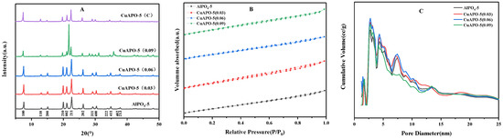 It is very important to study the porosity and BET-specific surface area of AlPO4-5-based materials doped with Cu. The N2 adsorption–desorption isotherms of CuAPO-5 catalyst are shown in Figure 1B.The information on the specific surface area and pore volume determination of the samples is shown in Table 1. The low temperature N2 adsorption and desorption curves of each sample are type IV, which is a typical mesoporous structure, and the hysteresis loop is type H3, suggesting that these samples are elongated porous materials.