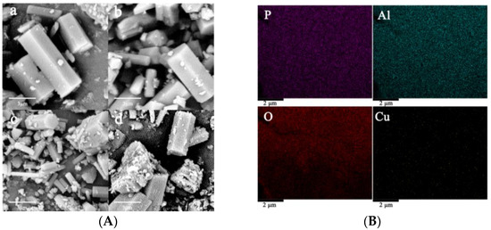 The morphologies of AlPO4-5 and CuAPO-5 molecular sieves were investigated by scanning electron microscopy, as shown in Figure 2A. Both AlPO4-5 and CuAPO-5 molecular sieves are hexagonal in shape, which is typical of AlPO4-5 molecular sieves [27]. The particle size is about 2 μm × 2 μm × 10 μm, and the surface is smooth, which indicates that the introduction of copper did not cause damage to the basic structure of AlPO4-5. When the Cu/Al ratio was introduced at 0.09, impurities other than hexagonal were generated, which is consistent with the appearance of heterocrystals in the XRD results. The metal signals of the CuAPO-5 molecular sieve, with a Cu/Al ratio of 0.06, were tested using the EDX point mapping technique, and the results are shown in Figure 2B. The signals of all metals appear in the EDX spectra with high dispersion.