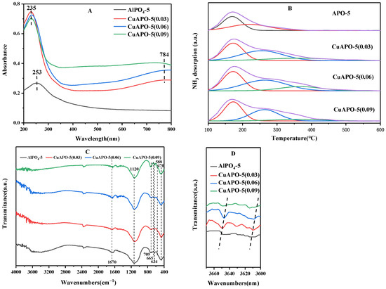 The FT-IR can be used to detect whether the heteroatoms enter into the skeletal structure from various aspects, and the FT-IR spectra of the calcined AlPO4-5 and CuAPO-5 are shown in Figure 4C,D. The IR spectra of CuAPO-5 and AlPO4-5 are basically the same. Among them, the strong broadband at 2500~4000 cm−1 and the absorption peaks at 1670 cm−1 are attributed to the -OH stretching vibration and bending vibration of water, respectively [33]. In the FT-IR spectra of AlPO4-5 and CuAPO-5, no vibrational peaks of CH2 were found below 3000 cm−1, which can indicate that the template has been completely removed after roasting [33]. The strong band at around 1120 cm−1 is assigned to the asymmetric P-O-Al stretching vibration characteristics [26]. In addition, the energy bands at 709 and 665 cm−1 are P-O-Al symmetric stretching and bending vibration modes, respectively, and the bands at 634 and 588 cm−1 are designated as double-loop vibration modes, while the band at 470 cm−1 can be designated as internal T-O bending mode vibration [34]. Compared with the AlPO4-5 molecular sieve, CuAPO-5 produced new hydroxyl absorption peaks at 3655 cm−1 and 3610 cm−1 and increased with the increase in Cu content. It is possible that this is due to the bridging hydroxyl group Cu-OH-P produced by Cu substitution of Al [35]. When the Cu/Al ratio was 0.09, no stronger absorption peaks appeared, which indicates that the addition of excess Cu to the gel does not favor the introduction of the framework.