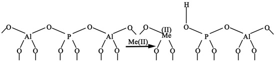 NH3-TPD is an effective tool to verify the incorporation of heteroatoms into the AlPO4-5 backbone. Substitution of Al(III) or P(V) with metal ions leads to the formation of Bronsted acidic sites [31]. This is because, when divalent metals are added to the framework by homocrystalline substitution, a hydroxyl group is created to ensure charge balance [32]. The process is shown in Figure 5.