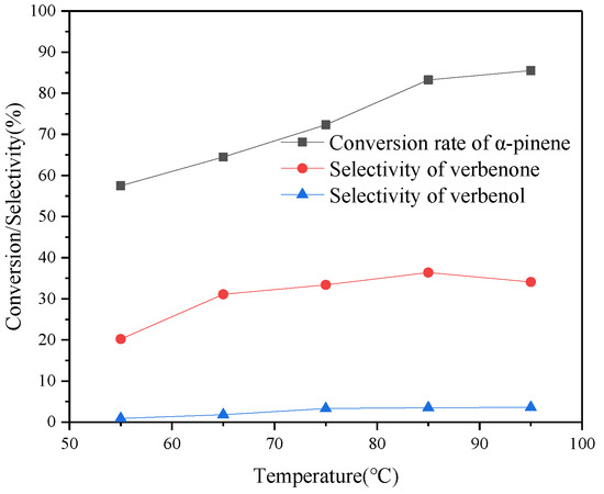 The oxidation of α-pinene was carried out according to different reaction temperatures, in the reaction conditions shown in Figure 6, to obtain verbenone with higher selectivity. The conversion of α-pinene was 57.5% when the reaction temperature was 55 °C and reached 83.2% at 85 °C, which indicated the significant effect of increasing the reaction temperature. The conversion changed less when the reaction temperature was further increased to 95 °C. This may be that the decomposition rate of TBHP at 95 °C does not increase much. While temperature and catalyst play an effect on the decomposition rate of TBHP, they also have a significant effect on the selectivity of α-pinene oxidation products. The selectivity of verbenone increased from 20.2% to 36.4% when the temperature was increased from 55 °C to 85 °C. When the temperature continued to increase to 95 °C, the selectivity of verbenone then decreased to 34.1%. This indicates that 85 °C is the optimal reaction temperature. The selectivity of verbenone increased from 0.9% to 3.6% when the temperature was increased from 55 °C to 95 °C. From the catalytic results obtained from different temperatures, it can be clearly concluded that the consumption of α-pinene and the production of verbenone and verbenol should be favored at a temperature of 85 °C.
