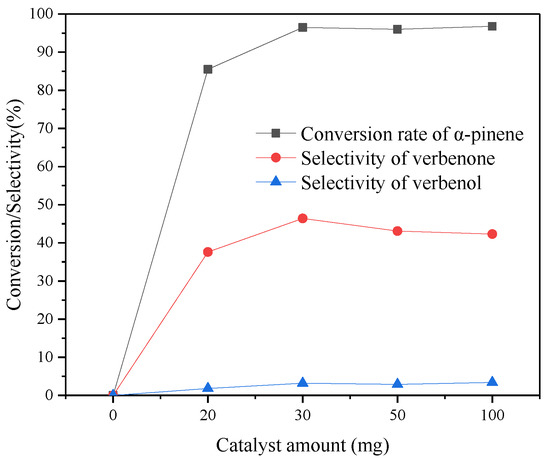 The influence of catalyst dosage on the synthesis of verbenone with α-pinene is shown in Figure 8. When no catalyst is added, α-pinene is not oxidized. When the dosage of CuAPO-5(0.06) increased from 20 mg to 100 mg, the conversion rate of α-pinene increased from 85.5% to 96.8%, and the selectivity of verbenone reached a maximum of 46.4% when the dosage reached 30 mg. Excessive catalyst is not conducive to the synthesis of verbenone.