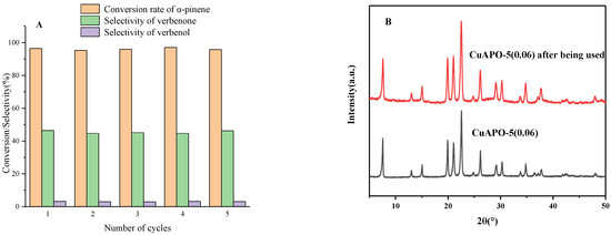 Stability check of CuAPO-5-catalyzed α-pinene synthesis of verbenone (A) and XRD spectrum of recovered CuAPO-5 (B).