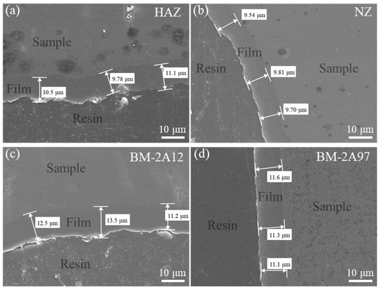 SEM was applied to investigate different areas of the FSW joint section after anodizing to evaluate the homogeneity of the obtained CSA film. As shown in Figure 1, the thickness of CSA film on each joint area (HAZ, NZ, BM-2A12, or BM-2A97) is relatively homogeneous, with a measured deviation of no more than 1.2 μm. The average thickness of CSA film on HAZ is 10.5 μm (Figure 1a), which is 9.7 μm for NZ (Figure 1b). The film thicknesses for BM are relatively larger than HAZ and NZ, which are 12.4 μm for BM-2A12 (Figure 1c) and 11.3 μm for BM-2A97 (Figure 1d). On the whole, the thickness of CSA film is fairly uniform, with values between 9.7~13.5 μm.
