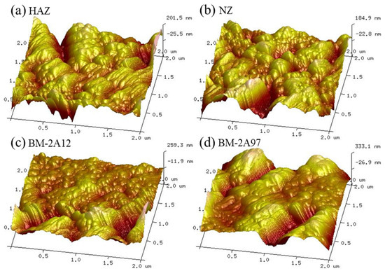 AFM images of the CSA film on different FSW joint areas. (a) HAZ, (b) NZ, (c) BM-2A12 and (d) BM-2A97.