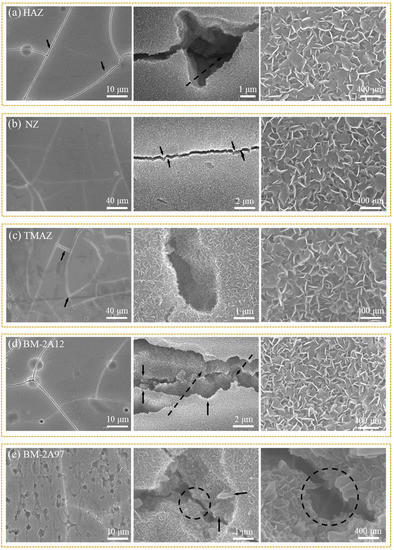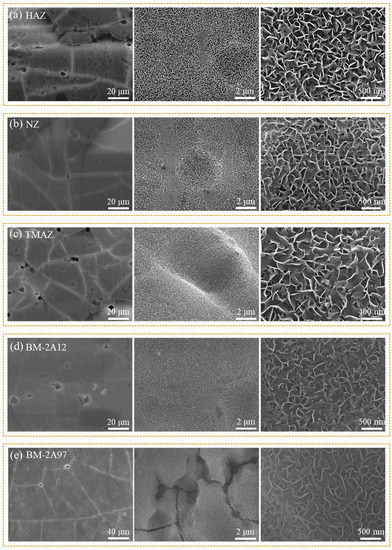 To improve the corrosion resistance of CSA film, LDH sealing film was in-situ synthesized after anodic oxidation. Under the alkaline condition, the Al3+ ions in the anodizing film would be transformed into Al(OH)3 collosol and then react with Li2CO3 to form LiAl-LDH nanosheets (Li2[Al2(OH)6]2CO3 ∙ nH2O) on the sample surface [33]. The microstructures of the obtained composite film (denoted as CSA-LDH film) in different areas were studied via SEM, and the results are shown in Figure 3. As can be seen from the low magnification images (left), the CSA-LDH film layer is overall smooth, and the cavity defects could be attributed to the dissolution of the second phase particles during the anodic oxidation process. The second phase particles in NZ were refined at high temperatures during the FSW process so that NZ exhibits the flattest surface (Figure 3b). The cavity defects in HAZ (Figure 3a) and TMAZ (Figure 3c) are more apparent, which could be ascribed to the recrystallization and growth of the second phase particles under heat effect. The second phase particles were bulky and sparse in BM-2A12, while tiny and numerous in BM-2A97, which can explain the different surface appearances in Figure 3d,e. The middle images with higher magnification indicate that the CSA-LDH film exists in the whole area, including the cracks and cavities, while some small cavities were even completely sealed. It can be concluded that a continuous CSA-LDH film was formed on the sample surface. At the same time, micro-cracks were found in the CSA-LDH film, which was caused by the film volume change during the sealing process. Zooming in further indicates the CSA-LDH film is composed of a petal-like lamellar structure (Figure 3a–e, right), which is a typical LDH structure.