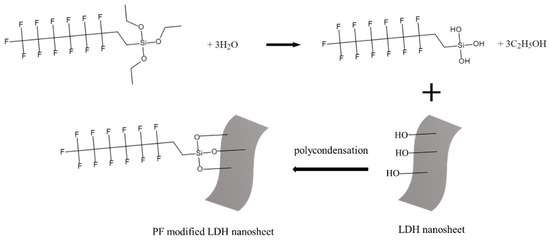 To further enhance the corrosion resistance of the aluminum alloy FSW joints, PF was applied to modify the obtained CSA-LDH film, and the obtained composite film is denoted as the CSA-LDF-PF film. The two-step chemical reactions during the modification process are described in Figure 4. The Si-OC2H5 group of PF was first hydrolyzed to form the Si-OH group. Then a polycondensation reaction occurred between the Si-OH group and the LDH surface-OH group.